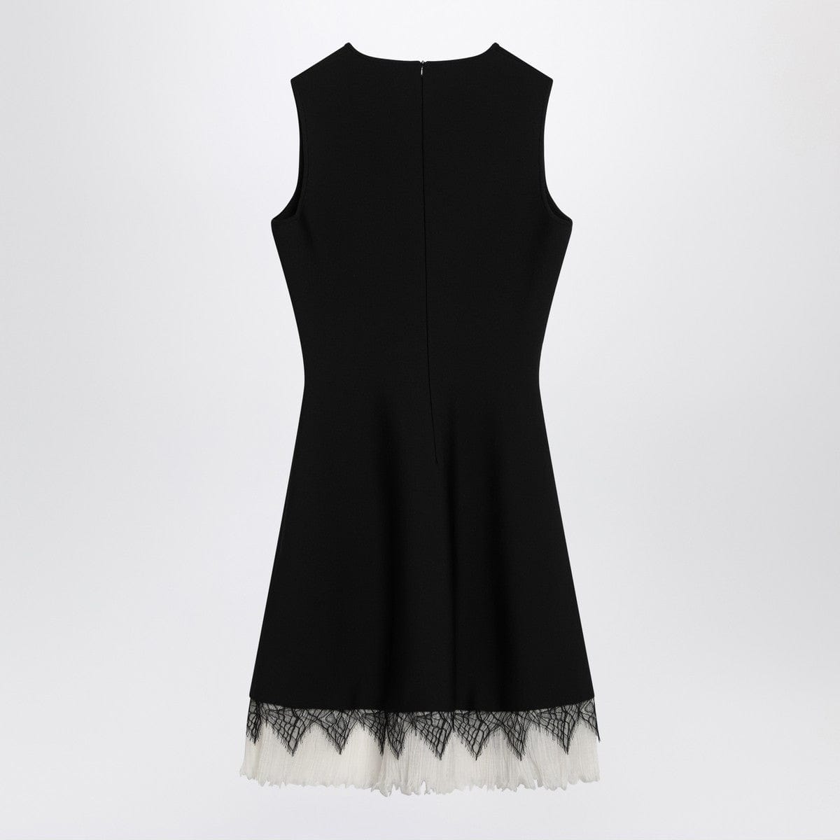 Sleeveless crew neck dress by Alexander McQueen in black stretch viscose, characterized by a flared skirt, black spider web lace finishes, ivory silk creponne at the bottom, and a zip closure at the back.