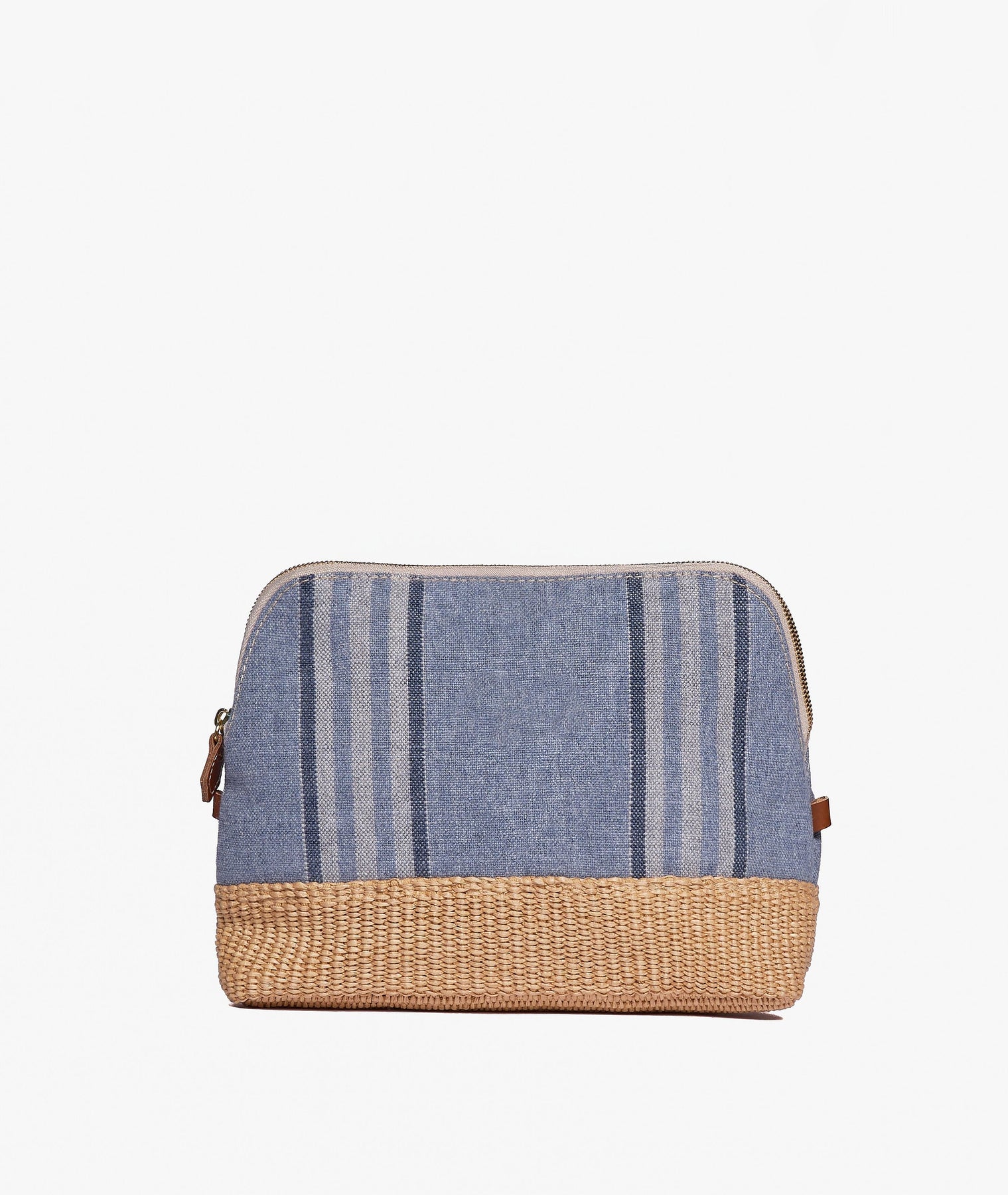 The My Style Bags Aspen Large Antibes Pouch in Sugar Paper Blue interprets Mediterranean elegance through a deep, refined shade inspired by coastal greenery and the sunlit landscapes of the Riviera. The striped fabric in green, sand, and ivory creates a natural, sophisticated colour balance, while the woven straw base adds a distinctive textured contrast with understated resort charm.