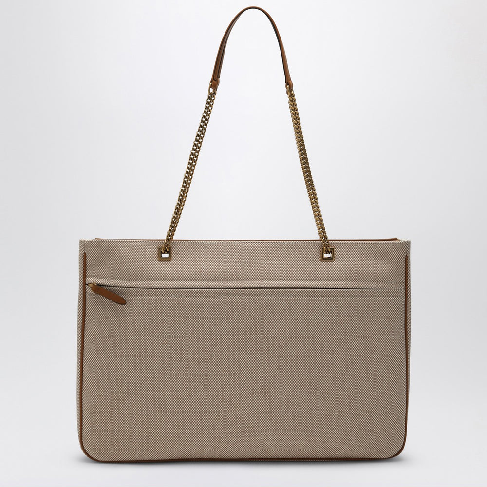 Large canvas bag by Valentino Garavani in natural color and brown leather, characterized by a contrasting maxi VLogo Signature on the front, sliding chain, antique gold metal hardware, zip closure, and a flat pocket with zip.